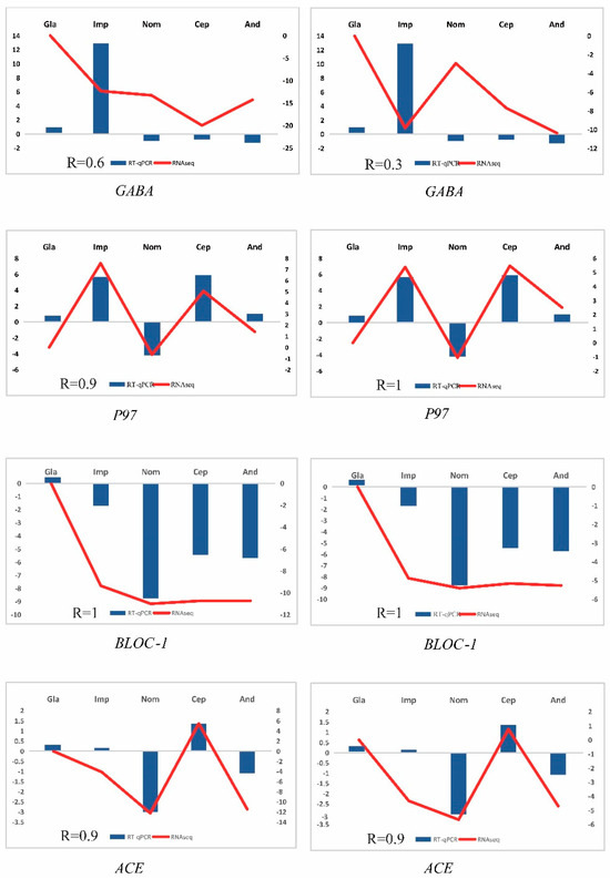 - Pan, H.; Yang, X.; Bidne, K.; Hellmich, R.L.; Siegfried, B.D.; Zhou, X. Selection of reference genes for RT-qPCR analysis in the monarch butterfly, Danaus plexippus (L.), a migrating bio-indicator. PLoS ONE 2015, 10, e0129482. [Google Scholar] [CrossRef]