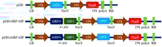 Schematic diagram of the vectors of pGH, pGH-GRF-GIF, and pGH-rGRF-GIF, respectively (Modified from Feng et al. []). GFP, Green Fluorescent Protein; GRF4-GIF1, Growth Regulating Factor 4-Growth Interacting Factor 1; HygR, Hygromycin Resistance gene; LB, Left Border of T-DNA; NosT, Nopaline Synthase Terminator; polyA, Polyadenylic acid; RB, Right Border of T-DNA; 4×Ala, A sequence with four alanine residues.