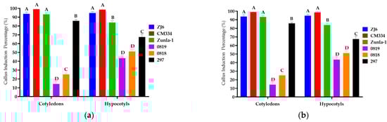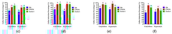 Effect of plant growth regulators (PGRs) and explants on callus induction in different varieties. (a) effects of 5 mg/L of BAP + 1 mg/L of IAA + 2 mg/L of ZT (Callus Induction Medium I) on ZJ6, CM334, Zunla-1, 0819, 0818, 297, and 348; (b) effect of 5 mg/L of BAP + 1 mg/L of IAA + 2 mg/L of ZR (Callus Induction Medium II) on ZJ6, CM334, Zunla-1, 0819, 0818, 297, and 348; (c) effect of 6 mg/L of BAP + 2 mg/L of ZR + 1 mg/L of NAA (Callus Induction Medium III) on ZJ6, CM334, and Zunla-1; (d) effect of 2 mg/L of ZR + 1 mg/L of IAA on ZJ6, CM334 and Zunla-1 (Callus Induction Medium IV); (e) effect of 4 mg/L of ZR + 5 mg/L of BAP + 1 mg/L of IAA (Callus Induction Medium V) on ZJ6, CM334 and Zunla-1; (f) effect of 5 mg/L of BAP + 1 mg/L of IAA (Callus Induction Medium VI) on ZJ6, CM334 and Zunla-1; and explants (cotyledons, hypocotyls, and roots) on callus induction. The ANOVA statistical analysis indicates that there are significant differences in the different letters (A, B, C, D, and E) among the varieties of explants (p < 0.05), whereas no significant differences are observed in the same letters among the varieties of explants in treatments.
