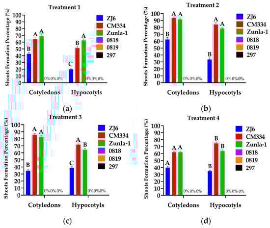 Effect of PGRs and explants on shoot formation in different varieties. (a) Effect of 5 mg/L of BAP + 1 mg/L of IAA (Shoot Formation Medium I) on ZJ6, CM334, Zunla-1, 0818, 0819, and 297; (b) Effect of 5 mg/L of BAP + 1 mg/L of IAA + 5 mg/L of AgNO3 (Shoot Formation Medium II) on ZJ6, CM334, Zunla-1, 0818, 0819, and 297; (c) Effect of 6 mg/L of BAP + 1 mg/L of IAA + 5 mg/L of AgNO3 (Shoot Formation Medium III) on ZJ6, CM334, Zunla-1, 0818, 0819, and 297; (d) Effect of 8 mg/L of BAP + 1 mg/L of IAA + 5 mg/L of AgNO3 (Shoot Formation Medium IV) on ZJ6, CM334, Zunla-1, 0818, 0819, and 297; and explants (cotyledons and hypocotyls) on shoot formation. The ANOVA statistical analysis indicates that there are significant differences in the different letters (A, B, and C) among the varieties of explants (p < 0.05), whereas no significant differences are observed in the same letters among the varieties of explants in treatments.