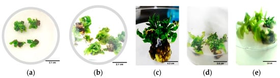 Shows shoot formation in different varieties. Shoot formation initiation of the CM334 (a,b) occurs after 48–60 days; Zunla-1 (c,d) after 48–80 days; and ZJ6 (e) after 30–60 days, for varieties derived from cotyledons and hypocotyls, respectively, in the shoot formation medium (5 mg/L BAP + 1 mg/L IAA + 5 mg/L AgNO3). Scale bars, 2.1 cm in (a,b), 4.3 cm (c), and 2.6 cm (d,e).