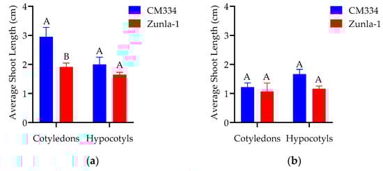 Effect of PGRs and explants on shoot elongation in different varieties. (a) The effect of 0.5 mg/L of GA3; (b) effects of 1 mg/L of GA3 on CM334 and Zunla-1 varieties using cotyledon and hypocotyl explants, respectively. This Figure represents the average shoot length for each variety. The ANOVA statistical analysis indicates that there are significant differences in the different letters (A and B) among the varieties of explants (p < 0.05), whereas no significant differences are observed in the same letters among the varieties of explants in treatments.