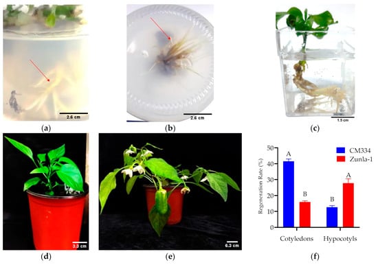 Different stages of the rooting and acclimatization and the regeneration rate. The described roots produced in rooting medium (a,b) after 20–30 days; Seedlings in tap water for one week (c); Seedlings in a Zip pot filled with peat moss soil (d,e) after 60–120 days. The regeneration rate of cotyledons and hypocotyls of the CM334 and Zunla-1 varieties, respectively (f). This Figure represents the regeneration rate on CM334 and Zunla-1 varieties using cotyledon and hypocotyl explants, respectively. ANOVA statistical analysis indicates that there are significant differences in the different letters (A and B) among the varieties of explants (p < 0.05). Scale bars, 2.6 cm in (a,b); 1.5 cm (c); 3.3 cm (d); and 6.3 cm (e).