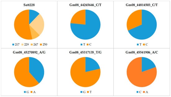 Allele frequencies at six marker loci associated with KTI content in the 165 soybean cultivars. Blue and orange colors indicate low- and high-KTI alleles, respectively.