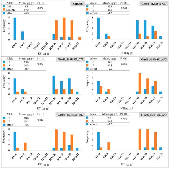 Frequency distribution of KTI content (µg g−1) in seeds of 38 soybean cultivars for low- and high-KTI alleles at six marker loci. Blue and orange bars indicate low- and high-KTI alleles, respectively. P > |t|—the significance of the t-test.