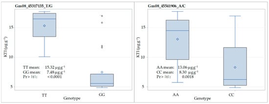 For the two remaining SNP loci Gm08_45317135_T/G and Gm08_45541906_A/C, a similar distribution of low- and high-KTI alleles was observed between the groups, with low-KTI alleles being more common in the low-KTI cultivars and high-KTI alleles prevailing in the high KTI group. The proportion of low-KTI alleles in the low-KTI group was 64% for both markers, while in the high-KTI group, it was 19 and 11% for Gm08_45317135_T/G and Gm08_45541906_A/C, respectively (Table S3). The low-KTI allele significantly reduced the KTI content by 4.5 µg g−1 (30%) and 6.0 µg g−1 (39%) for the markers Gm08_45317135_T/G and Gm08_45541906_A/C, respectively (Figure 2).