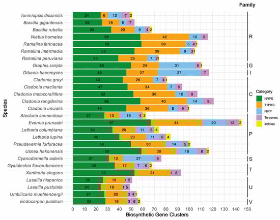 Diverse classes (categories) of secondary metabolites annotated for the selected lichen-forming fungi are given in color with the color code on the right-hand side. The total number of biosynthetic gene clusters is given on the x-axis, and the species names are on the y-axis. The following single letter code indicates families: C: Cladoniaceae, G: Graphidaceae, I: Icmadophilaceae, P: Parmeliaceae, R: Ramalinaceae, S: Stictidaceae, T: Teloschistaceae, U: Umbilicariaceae, and V: Verrucariaceae.