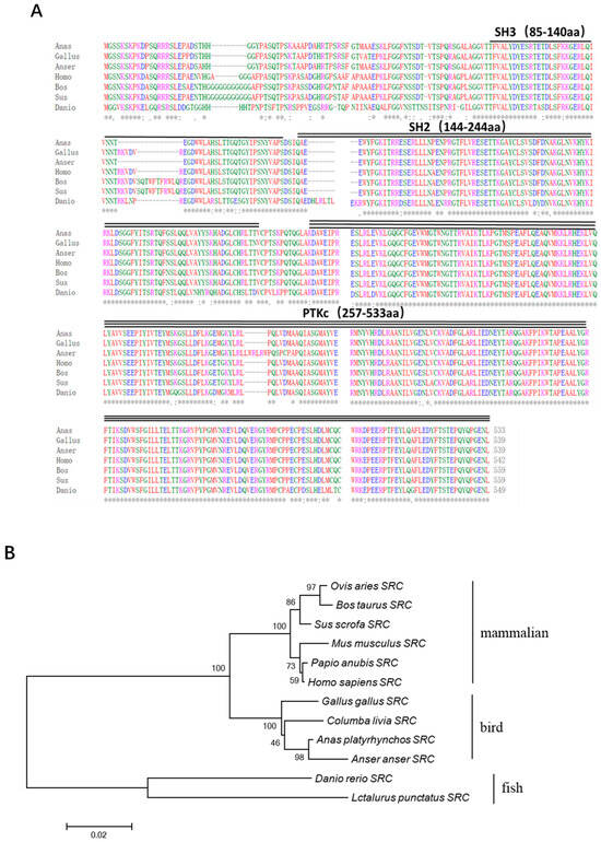 (A) The SRC protein sequences of duck (PP987474.1), chicken (NP_990788), goose (XP_047902369), human (NP_938033), cattle (NP_001104274.1), pig (XP_020933628.1), and zebrafish (NP_001003837.2) were performed in multiple alignments. The symbol ‘*’ is used here to identify 100% conserved residues. (B) Using version 6 of MEGA software, phylogenetic trees derived from SRC amino acid sequences were constructed via the neighbor-joining method. The protein sequences for each species were sourced from the NCBI GenBank database, which ensured the authority and accuracy of the data. The bar visually shows the percentage of bootstrap values for each branch to facilitate the observation and interpretation of confidence levels in evolutionary relationships.