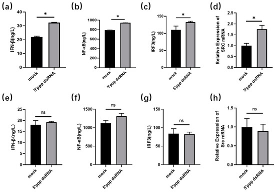 Response of chicken (e–h) and duck embryonic fibroblasts (a–d) to 5′ppp dsRNA stimulation. The DEF and DF1 cells were cultured separately in six-well plates until their growth state reached a density of about 70 to 80 percent. Subsequently, Lipofectamine 3000, a highly effective transfection agent, was used to transfer 5′ppp dsRNA into these cells to simulate RNA virus stimulation. Cell precipitates were collected, and proteins and RNA extracted, for detection of the expression level of IFN-β, NF-κB, and IRF3 by ELISA, and detection of the mRNA expression level of duSrc by RT-qPCR (n = 3). In the statistical analysis, we applied the unpaired two-tailed t-test (* p < 0.05).