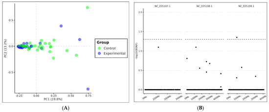 PCA analysis showed SNP clustering for control and experimental groups (Figure 2A). The clustering is mainly represented by the first principal component, which corresponds to the major explained variance (19.8%). PERMDISP analysis revealed significantly different variability between groups [F(1.50) = 6.05, p = 0.02*]. The association test between control and experimental groups presented two significant SNPs (Figure 2B) adjacent to the gene region of the “neuropeptide CCHamide-2 receptor”. The SNPs were found at the positions (NC_035109.1:96061807:A:G) e (NC_035109.1:96061808:A:G).