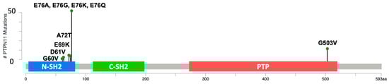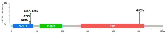 A lollipop plot of somatic mutations found in the HS samples diagramed on a PTPN11/SHP2 protein domain map, modeled after similar plots on cbioportal.org (accessed on 6 January 2024). The two Src homology domains are indicated with the label SH2, the N-terminal SH2 domain is indicated in blue, the C-terminal SH2 domain is indicated in green, and the phosphatase domain is indicated in red. The numbers along the x axis indicate the amino acid (aa) residues from the N to the C terminal of the SHP2 protein.