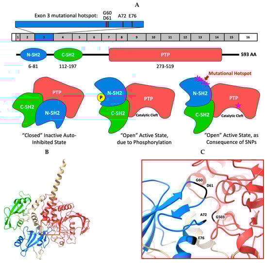 Cartoon and 3D model representation of the canine SHP2 protein. The protein transcript used is the 593 amino acid peptide (A0A4D6PF96). (A) A schematic domain map depicting the locations of the N- and C-terminal SRC homology 2, or SH2, domains (blue and green) and phosphatase, or PTP, domain (red), with depictions of the auto-inhibited inactive and “open” active conformations of the SHP2 protein. In its inactive state, the N-SH2 domain binds to the PTP domain around the PTP catalytic site. Mutations in the N-SH2 and PTP domains help to promote the “open” conformation. Pink stars represent SNPs that result in the promotion of the active state and increased catalytic activity. Additionally, an exon map of the SHP2 protein highlights the exon 3 mutational hotspot. (B) 3D model of the SHP2 protein depicting the auto-inhibited conformation. The catalytic cleft is bounded by a red box. (C) Zoomed in view of a portion (highlighted in panel (B)) of the cleft encompassing numerous known mutation sites, including the mutations presented here. The residues G60, D61, A72, and E76 are located in the N-SH2 domain (E69 not captured in panel (C)). The G503 residue is located in the PTP domain. Cartoon inspired by Chen et al. [25]. 3D protein models were generated from AlphaFold [26,27] and UCSF ChimeraX [28].