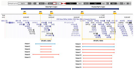 | 12 | M | 7 years | arr[GRCh37] 16p11.2(29656684–30190568) ×1/534 Kb | BP4–BP5 (Proximal) | SPN, QPRT, C16orf54, ZG16, KIF22, MAZ, PRRT2, PAGR1, MVP, CDIPT, CDIPTOSP, SEZ6L2, ASPHD1, KCTD13, TMEM219, TAOK2, HIRIP3, INO80E, DOC2A, C16orf92, TLCD3B, LOC112694756, ALDOA, PPP4C, TBX6, YPEL3, LOC101928595, GDPD3, MAPK3 | Developmental delay, ASD, attending regular school with occasional additional help, and no dysmorphic features | |