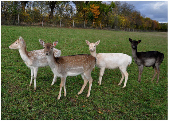 Fallow deer are a valuable game species and are commonly found outside of their historical habitats today [10]. Although the species is reared in farms as fenced animals, fallow deer are rather tamed than domesticated. Notably, the species has a considerable variety of fur colors on farms and in the wild (Figure 1).
