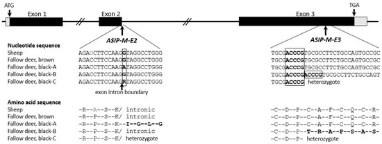 For the ASIP gene, the sequence of fallow deer for all three exons and the adjacent intron areas were successfully sequenced (sequences are in Figure S1), leading to the detection of two mutations that are homozygous only in black animals. One mutation, ASIP-M-E2 (g.338G>A), lies exactly at the boundary from exon 2 to intron 2 after amino acid position 75 (Figure 2). This significantly affects the splicing process. If, as a result of failed splicing between exon 2 and exon 3, the intron sequence is read further as exon 2, there would be a stop after 23 amino acids derived from the subsequent intronic sequence. The second mutation, ASIP-M-E3 (g.100-104insACCCG), which was found in exon 3, is an InDel of five nucleotides. This frameshift mutation after amino acid 111 completely changes the following amino acid sequence. In both cases, the cysteine-rich domain on the carboxy-terminal end, which is important for the three-dimensional protein structure over disulfide bonding [15,28], is destroyed. A study in mice confirmed that the third exon of ASIP (a fragment of amino acids from position 91 to 131) is important for its antagonistic effect on melanocyte-stimulating hormone [29]. Although all wild fallow deer were brown, the mutation ASIP-M-E2 was found to be heterozygous. The mutation ASIP-M-E3 was not present.