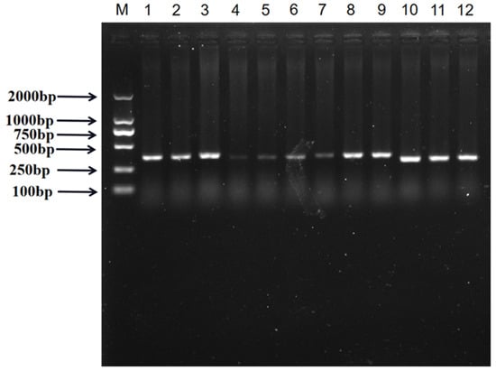 Agarose electrophoresis of PCR products of pig METTL23 gene, M, DL 2000 DNA marker; 1–3, P1 amplification product; 4–6, P2 amplification product; 7–9, P3 amplification product; 10–12, P4 amplification product.