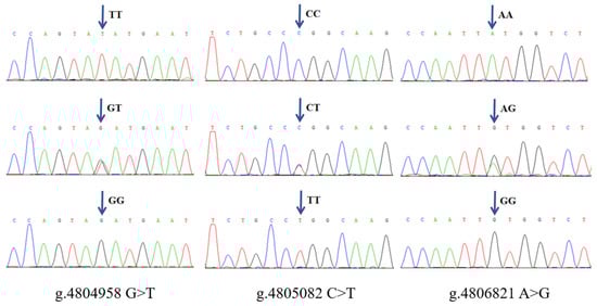 Agarose gel electrophoresis of PCR products showed that the amplified bands were clear, and the fragment sizes were consistent with the target fragments (Figure 1). Sequencing results of PCR products were further compared and analyzed. As shown in Figure 2, a total of three SNPs were found in the SNPs of g.4804958 G > T, g.4805082 C > T, and g.4806821 A > G, which existed in all three genotypes. Among them, the SNP g.4804958 G > T was located in intron 2, and the SNP g.4805082 C > T was located in exon 2. The coding amino acid codon had a mutation from CCC to CCT, and the coding amino acids were all proline (P), which was a synonymous mutation. Moreover, the SNP g.4806821 A > G was located in exon 3, the coding amino acid codon had a mutation from TTA to TTG, and the coding amino acids were all leucine (L), also a synonymous mutation.