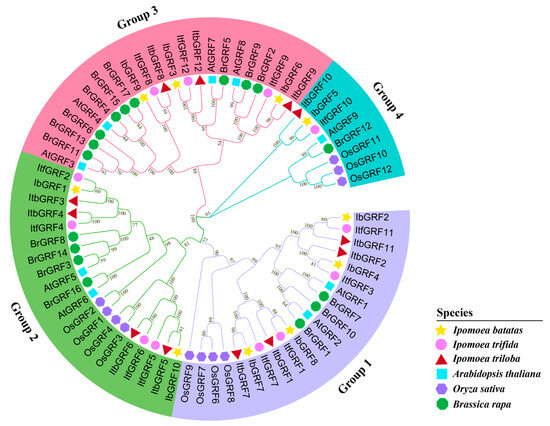 2.3. Phylogenetic Relationship Analysis of GRFs in Sweet Potato and Its Two Diploid Relatives