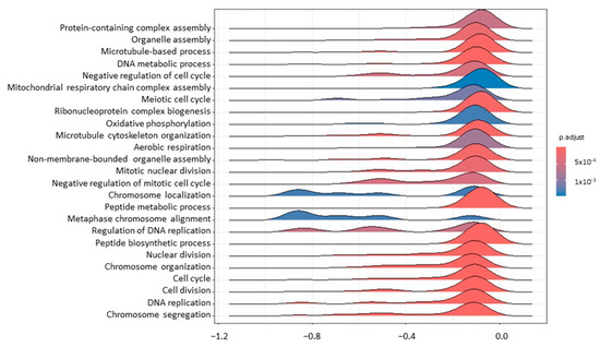 A ridgeplot of the 25 most significant terms as results of GSEA comparing tumour T1 vs. T0. The colour gradient is related to the level of significance, adjusted with the Benjamini–Hochberg method.