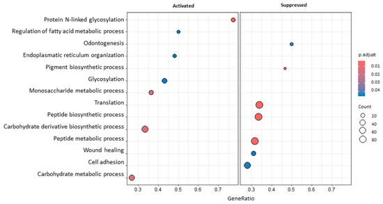 Moreover, the gseGO function from the clusterProfiler package (v.4.10.0; [65]) was applied to perform the Gene Set Enrichment Analysis (GSEA). A list of genes produced by the glmLRT function was used to create the input file for this computational analysis, pre-ranking all genes according to their BHp using “1-BHp” and “-(1-BHp)” to include the direction of their expression in the analysis (up- or downregulation, respectively).
