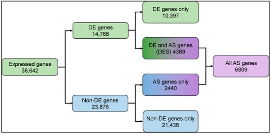 Summary of differential gene expression and transcript splicing observed in rice seedling shoots undergoing photomorphogenesis. Expressed genes: total number of expressed genes in rice transcriptome; DE genes: differentially expressed genes; Non-DE genes: genes with no significant difference in expression; AS: alternatively spliced; DES: differentially expressed and spliced. Expressed and differentially expressed gene counts are represented by green shaded boxes, non-DE genes in blue shaded boxes, and AS genes in purple boxes. Mixed color boxes represent gene counts from overlapping AS, DE, and non-DE.