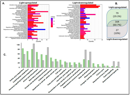 Pathway enrichment analysis using the Plant Reactome. (A) Plant Reactome pathway enrichment analysis plots. (B) Unique and shared pathways enriched for the light-upregulated and downregulated gene sets. (C) Counts of genes mapped to some of the common Plant Reactome pathways. Light-upregulated (green) and downregulated (grey).