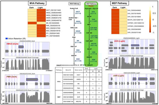 We investigated the light-induced differential splicing events in the MEP and MVA pathway genes. Four MVA pathway genes (acetyl-CoA acetyltransferase: AACT, hydroxymethyl glutaryl CoA synthase: HMGS, mevalonate kinase: MK, phosphomevalonate kinase: PMK) and three MEP pathway genes (1-deoxy-D-xylulose-5-phosphate synthase: DXS, 1-deoxy-D-xylulose-5-phosphate reductoisomerase: DXR, 2-C-methyl-D-erythritol2,4-cyclodiphosphate synthase: MECPS) showed intron retention events in the dark (Figure 3). The gene MK showed a novel light-induced exon-skipping event.
