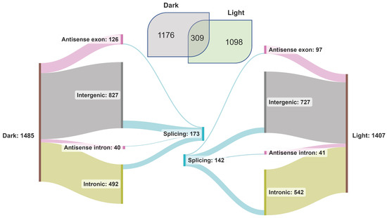 lncRNAs are known to regulate diverse biological processes in plants, including photomorphogenesis [74], and as described above, are categorized into four major types based on their location in the gene space and on the DNA strand. We used our transcriptome data to characterize light-induced rice lncRNAs (Figure 4). We identified 1485 and 1407 lncRNA transcripts in the dark and light samples, of which 309 were common. Many lncRNAs from intergenic and intronic regions were identified (Figure 4). To discover novel lncRNAs, the transcripts from our datasets were queried against the custom BLAST database of rice lncRNAs. About 44% of the total lncRNA transcripts (2583) found a match in the BLAST database (Supplementary Table S6). A total of 173 lncRNAs spliced under dark and 142 spliced under light conditions, most located in the intergenic regions (Figure 4). Interestingly, all the spliced lncRNA genes from both datasets were from Chr1, Chr10, Chr11, and Chr12. The maximum number of spliced lncRNA genes was from Chr1, followed by Chr11, 12, and 10. Among all the splicing events, IR was predominant under both conditions.