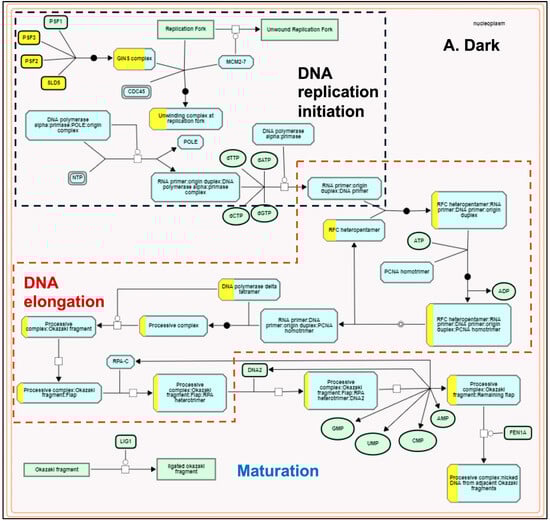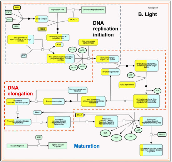 Plant Reactome pathway enrichment showing light-regulated genes and reaction event coverage for the DNA biosynthesis pathway of the G1-to-S phase mitotic cell cycle. (A) shows enrichment in dark conditions and (B) shows enrichment in light conditions. Each reaction has several input and output entities and may be regulated or catalyzed by a protein and or a protein complex. Solid arrows depict the directionality. The view also shows overlaps between the sub-pathways. The boxes with yellow-painted areas show the gene coverage (the number of genes mapped to the protein or protein complex entity participating in the respective reaction).