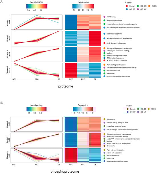 This study identified seven major clusters in the proteome and phosphoproteome with significant enrichment features (Figure 3). Three similar pairs of protein enrichment trajectories and the corresponding three classes of DAP-DRPPs with different trajectory patterns from the seven protein clusters in the proteome and phosphoproteome were summarized (Table S2). As SE progressed, class 1 proteins exhibited a pattern of abrupt surges, followed by a flat or slight slope, from the NEC to the PEC to the GE. This protein cluster was significantly and simultaneously enriched in the term ‘cellular nitrogen compound metabolic process’, and nitrogen metabolism-related proteins play a crucial role in protein synthesis and amino acid supply. They are involved in the processes of synthesis, catabolism, and translocation of amino acids to meet the nitrogen source requirements for plant growth and development [30,31]. Therefore, our study suggests that the up-slope enrichment pattern of these proteins may be a significant characteristic of plant regeneration initiation. Furthermore, in class 2, DAPs-DRPPs from proteome clusters 2 and 3, as well as phosphoproteome-cluster 2, were upregulated linearly. These clusters were primarily enriched in GO biological processes, such as reproductive structure development, system development, and postembryonic development, as well as KEGG pathways, such as ribosome biogenesis in eukaryotes. These findings suggest a potential positive regulation of embryogenic differentiation, particularly in the formation of somatic embryos. Proteome-cluster 4 and phosphoproteome-cluster 3 exhibited an opposite pattern to classes 1 and 2. Changes in phosphorylated protein levels can disrupt the balance of hormones involved in SE. Therefore, the downregulation of phosphorylated proteins may indicate a shift in cellular resources and signaling priorities toward defense responses.