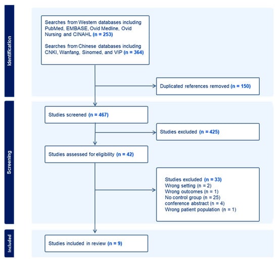 As shown in the PRISMA flow diagram (Figure 1), the systematic search strategy identified 253 publications from Western databases and 364 from Chinese databases, of which 150 were duplicates. The remaining 467 studies were screened by two reviewers for relevance by title and abstract, resulting in the removal of 425 studies. Full text screening of the remaining 42 studies excluded a further 33 studies, which did not meet inclusion criteria. Most excluded studies had no control group (n = 25). Other reasons for exclusion include wrong setting (n = 2), wrong outcomes (n = 1), wrong patient population (n = 1), and not a full research publication (n = 1). Finally, a total of nine studies, which fulfilled inclusion criteria, were included and evaluated in this systematic review [19,20,21,22,23,24,25,26,27]. Eight studies were published in English and one in Chinese language.