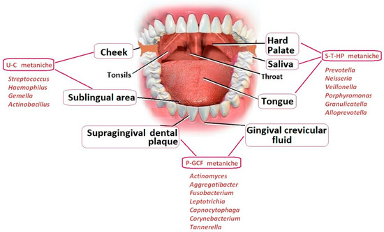 The different areas and the typical bacteria that could potentially invade the oral microbiota.