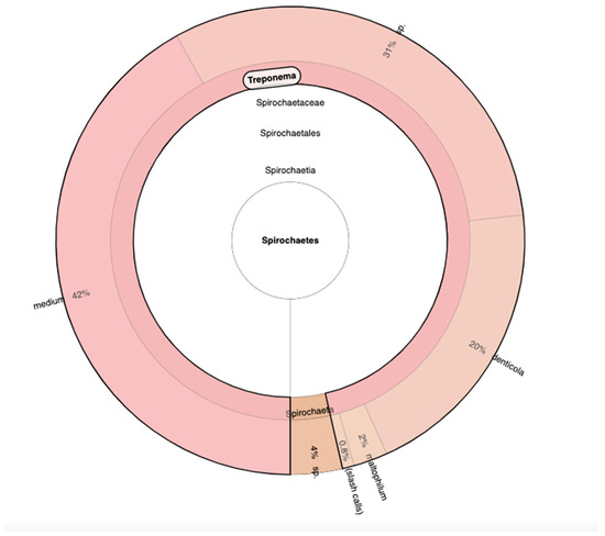 Due to the characterization of all the bacteria communities based on hypervariable regions, we discovered and detected with primer V2, V3, V6, V7, and V8 the presence of a new phylum that we had never encountered, the Spirochaetes phylum. In particular, the genus Treponema was over 90% of the entire phylum. Continuing the phylogenetic analysis, the most abundant species are T. medium with 42%, Treponema sp. with 31%, and T. denticola with 20% (Figure 4).