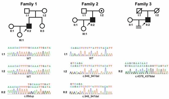 Participant genomic DNA was isolated from peripheral blood lymphocytes using QIAamp DNA Blood Kits (Qiagen, Hilden, Germany). Library preparation and exome enrichment were performed using SureSelect Human All Exon V6 (Agilent Technologies, Santa Clara, CA, USA). The prepared libraries were then sequenced with the Illumina NovaSeq® 6000 system (Illumina, San Diego, CA, USA). The original sequencing data were mapped to the human genome assembly GRCh37/hg19 using Burrows–Wheeler Aligner (BWA) [14]. After alignment, Picard tools removed PCR duplicates and evaluated the quality of the sequencing data. Variant calling and annotation were performed using the Genome Analysis Toolkit (GATK) [15]. The obtained variants were filtered and prioritized using TGex (https://fa.shanyint.com/, accessed on 25 May 2024) [16]. Genes with a definitive, strong, moderate, or limited strength association to male infertility were prioritized. The gene variants detected by WES were verified by Sanger sequencing. Amplification and subsequent Sanger sequencing were performed using the following primers: Family 1, SYCP2-c.89dup-F = GGTTTTGATACAGTATGTGCCATT and SYCP2-c.89dup-R = AATTATGACTGAGCTTGCCCA; Family 2, SYCP2-c.946_947del-F = CTTGCTTTAGCCATGAATATAACAT and SYCP2-c.946_947del-R = ATTTATAATTAGCTTGGTAGGTTGCT; Family 3: SYCP2-c.4378_4379del-F = CTTTGATAATGAGAAATCCTGAGAGA and SYCP2-c.4378_4379del-R = CAGAAGACACTTTTAGCCAATGAA.