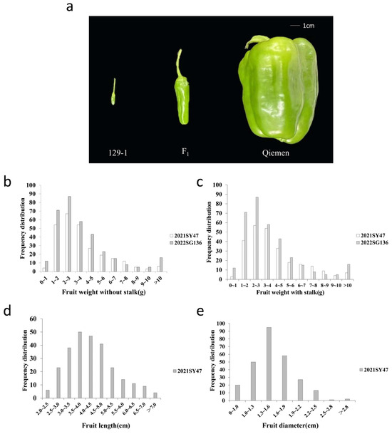 Frequency distribution of F2 (Qiemen × 129−1). (a): Fruit of parents and F1 fruit. (b): Frequency distribution per fruit weight without stalk removed in F2 population (Qiemen × 129−1). (c): Frequency distribution per fruit weight with stem removed in F2 population (Qiemen × 129−1). (d): Frequency distribution of fruit length removed in F2 population (Qiemen × 129−1). (e): Frequency distribution of fruit diameter removed in F2 population (Qiemen × 129−1).