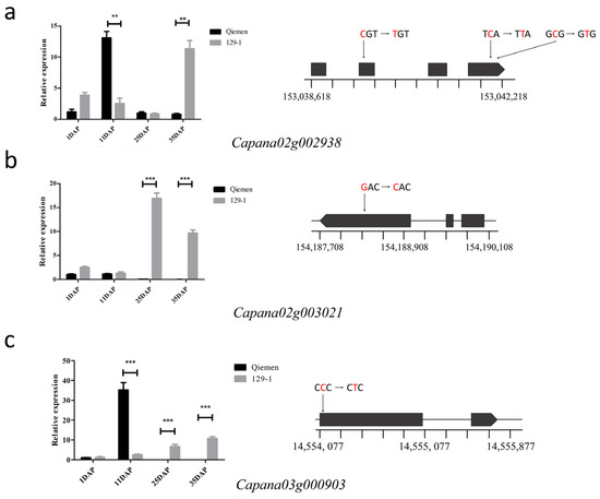 Validation and expression analysis of selected genes using qRT-PCR. (a) Sequence difference of Capana02g002938 in Qiemen and 129−1 and expression difference in different developmental stages of fruit; (b) sequence difference of Capana02g003021 in Qiemen and 129−1 and expression difference in different developmental stages of fruit; (c) sequence difference of Capana03g000903 in Qiemen and 129−1 and expression difference in different developmental stages of fruit. **: p < 0.01; ***: p < 0.001.