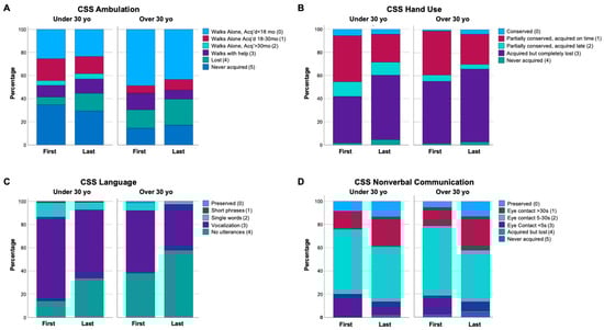 Within the older cohort (≥30 yo), a number of clinical features were unchanged from the first to last visit (Table 6), similar to previous reports indicating that clinical features are stable in older individuals with RTT []. However, a number of clinical features were different between first to last visit in ≥30 yo cohort (Table 6). Worsening for the ≥30 yo was observed for gross motor skills (MBA Motor Skills, CSS Ambulation trend p = 0.089), fine motor abilities (CSS Hand Use, MBA Does Not Reach for Objects/People), verbal communications (CSS Language, MBA Verbal Skills, MBA Speech Disturbance), oro-motor function (MBA Chewing Difficulties), and movement disorders (MBA Hand Stereotypies, MBA Dystonia, MBA Dyskinesia). Interestingly, nonverbal communication (CSS Nonverbal Communication, MBA Does Not Follow Verbal Commands) showed improvement from the first to last visit in the ≥30 yo cohort. Representative distributions of CSS or MBA items that had significant change from first to last visit in the ≥30 yo cohort are shown in Figure 2 displays representative distributions of selected CSS items that show change from first to last visit in both the <30 yo and ≥30 yo cohorts, with CSS Ambulation, CSS Hand Use, and CSS Language showing progressive worsening in both the younger and older cohorts (Figure 2A–C), and CSS Nonverbal Communication showing progressive improvement in both cohorts (Figure 2D). Overall, while the progressive worsening in some clinical features is expected in the <30 yo group, these results demonstrate that some clinical features improve in the <30 yo group and in contrast to previous reports, older people with RTT continue to show changes in clinical features with ongoing worsening of many functional skills, but improvement in nonverbal communication.