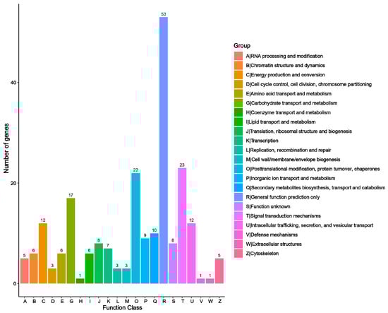In KEGG pathway annotation, unigenes were classified into 22 terms across five categories (Figure 2). The organismal systems category contained only one term related to environmental adaptation, encompassing 2225 annotated unigenes. The metabolism category contained 11 terms and had the highest number of unigenes, with 4247 annotated in terms of global and overview maps and 1370 in carbohydrate metabolism. The genetic information processing category consisted of five terms, with 800 unigenes annotated in terms of folding, sorting, and degradation. In the category of environmental information processing, 1473 unigenes were annotated for signal transduction and 175 for membrane transport. In terms of transport and catabolism, 572 unigenes were annotated. In the KOG database, orthologous unigenes were classified into 22 groups. The top groups, based on the number of annotated unigenes, were general function prediction only, signal transduction mechanisms, and posttranslational modification, protein turnover, chaperones (Figure 3). Species homology comparison in the Nr database showed that 73.31% of S. superba unigenes were aligned to Camellia sinensis, followed by C. sinensis var. sinensis, accounting for 7.83% (Figure S2A). A total of 1504 TFs were identified and classified into 52 families (Table S4), with the top 20 families shown in Figure S2B. The majority of TFs were families of MYB and MYB-related AP2 and ERF, accounting for 10.509%, 10.008%, 9.59%, and 9.34% respectively (Figure S2B).