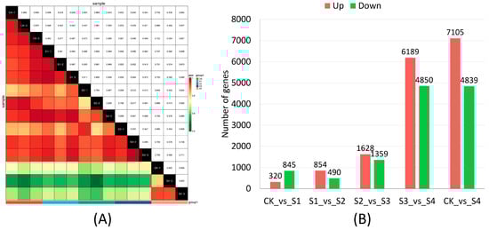 The results showed that the correlation coefficient in major sample comparisons was above 0.9 (Figure 4A). Using the criteria for identifying differentially expressed genes (DEGs), the number of DEGs was identified between the two groups (Figure 4B). Comparisons between the groups revealed that, relative to the CK group, most unigenes were up- and down-regulated in the S4 group. In the comparison between S3 and S4, the number of DEGs was similar to that in the comparison between CK and S4, but significantly higher than in the comparison between CK and S1, S1 and S2, and S2 and S3 (Figure 4B). Detailed information on DEGs is provided in Table S5.