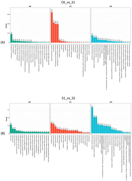 The GO enrichment of differentially expressed genes in S. superba. (A,B) represent the comparisons of CK_vs_S1 and S1_vs_S2.