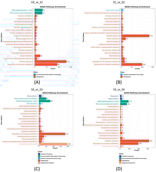 KEGG enrichment revealed the top 20 terms across four comparisons (Figure 7). The metabolism class was the predominant term that enriched in four comparisons. Within this class, the term of metabolism pathways was enriched in three comparisons and had the most DEGs, followed by the term of biosynthesis of other secondary metabolites (Figure 7A,B,D). The second major class was the environmental information processing, which contained two terms of MAPK signaling pathway and plant hormone signal transduction. These terms were enriched in three of the comparisons, excluding S1_vs_S2 (Figure 7A,C,D). The cellular processes class contained two terms of motor proteins and phagosome, with both enriched in the comparison of S3_vs_S4, while only the motor proteins term was enriched in comparison of S2_vs_S3. The plant-pathogen interaction term, part of the organismal systems class, was only enriched in the comparison of S2_vs_S3, and had 196 DEGs, representing the most unigenes. The term circadian rhythm was enriched in the comparison of S3_vs_S4 (Figure 7).