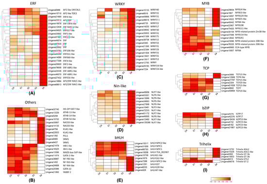 Heatmap of the differentially expressed transcription factors involved in heat response and recovery in S. superba. Red means up-regulation, and white means down-regulation. (A), (C–I) represent different TF families, and (B) contains several TFs that changed expression levels in response to heat stress.