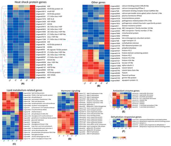 Heatmap of the differentially expressed functional genes related to heat response and recovery in S. superba. (A) Heat shock protein genes; (B) Other genes; (C) Lipid metabolism-related genes; (D) Hormone signaling; (E) Antioxidant enzyme genes; (F) Dehydration-responsive genes. Red means up-regulation, and blue means down-regulation.