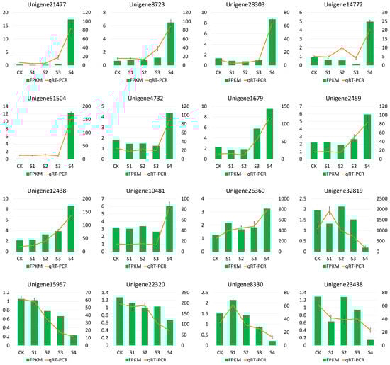 To validate the accuracy of RNA-Seq, 16 DEGs related to heat stress response were randomly selected for qRT-PCR. The results showed a high degree of consistency between RNA-Seq and qRT-PCR (Figure 10). For instance, genes such as HSF30 (Unigene21477), protein early-responsive to dehydration (Unigene8723), ABC transporter (Unigene28303), ABA 8′-hydroxylase (Unigene14772) and WRKY31 (Unigene51504) exhibited significant up-regulation in the group that had undergone 24 h of recovery after heat stress. On the contrary, genes related to auxin-binding protein (Unigene32819), MYB4 (Unigene15957), and gibberellin 20-oxidase (Unigene8330) had the lowest expression levels in the recovery group (Figure 10).
