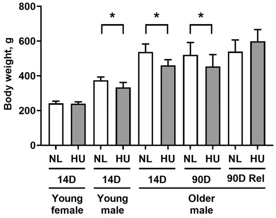 Body weights of animals included in this study. NL: normally loaded; HU: hindlimb unloading; Rel: reambulated (reloading). The HU group was compared to their age- and sex-matched NL controls by Student’s t-test. Sample sizes: N = 5–8/group for all groups except for 90D older males, where N = 3. Values depicted are means and standard deviation. * Significant at p < 0.05 by Student’s t-test.