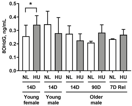 To determine whether simulated microgravity leads to alterations in redox balance in cardiac tissue, we measured levels of 8-hydroxydeoxyguanosine (8-OHdG) in left ventricular tissue (Figure 2). 8-OHdG is a marker for oxidative damage to DNA. Young females after 14 days of HU displayed a modest yet statistically significant increase in 8-OHdG levels (33.2%) compared to age- and sex-matched controls. At 14 days of HU, no differences were observed between HU and control groups in young and older males. Older males at 90 days of HU did not exhibit any significant difference in 8-OHdG levels versus corresponding controls. We further hypothesized that reloading will lead to increased oxidative damage to hearts due to altered fluid distribution and increased functional demand on the heart. Hence, we examined 8-OHdG levels at an earlier timepoint of reambulation (7 days) where we found no differences in 8-OHdG levels in older males that underwent normal reambulation after 90 days of HU relative to controls.