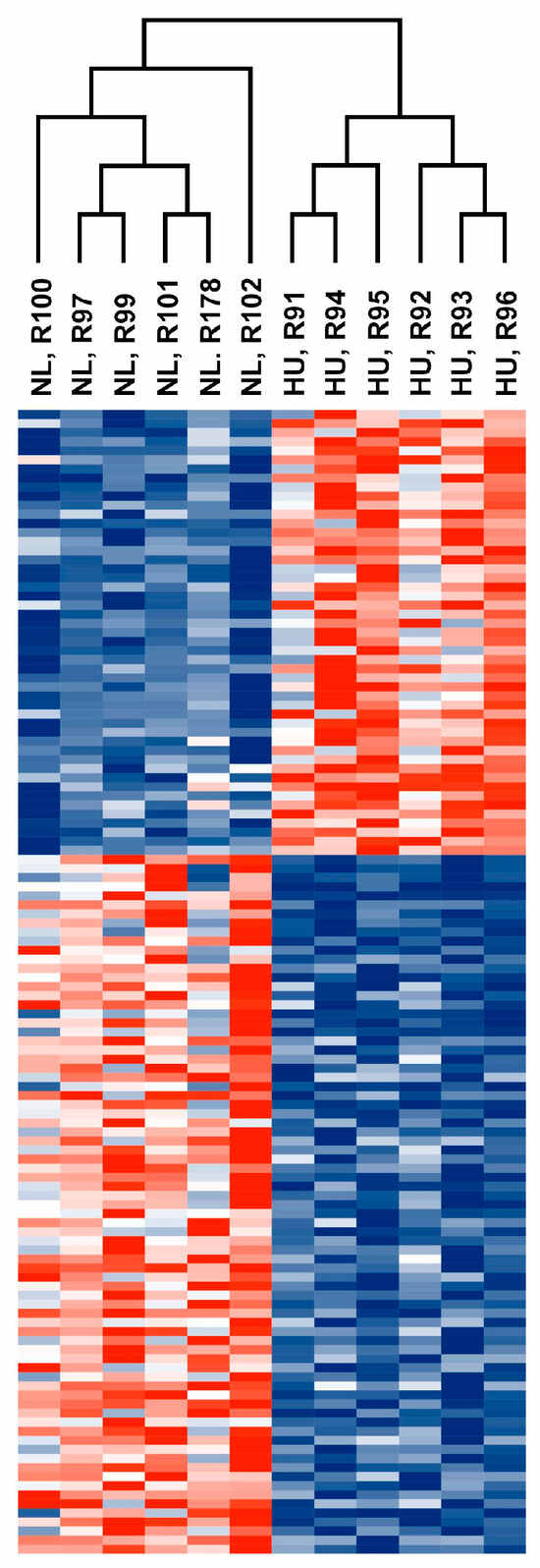 Heatmap showing normalized counts of differentially expressed genes from older male 14D NL and HU groups. Each cell corresponds to a gene. Red: Upregulated in 14D HU relative to NL group. Blue: Downregulated in 14D HU relative to NL group. Magnitude of upregulation or downregulation is proportional to the intensity of red or blue. Deepest red: most upregulated; deepest blue: most downregulated.