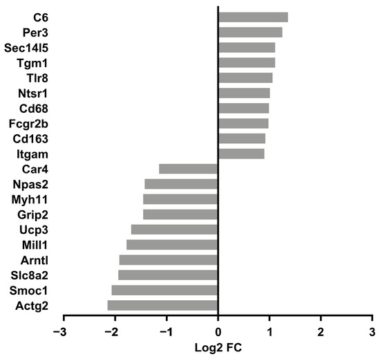 Gene enrichment analysis of DEGs that met the FDR threshold revealed a predominance of immune-related processes including macrophage activation and complement activation. Further, circadian signaling, vesicle-mediated transport, and redox signaling were differentially enriched (Figure 7; refer to Table S2 for full list). Gene enrichment analysis for disease phenotypes using Toppfun [21,22] also revealed enrichment of a subset of DEGs linked to cardiovascular disease (CVD), immune dysfunction, neurovascular disease, cancer, metabolic disease, and sleep disorders. Cardiovascular pathologies represented include hypertensive disease, myocardial infarction, and heart failure. Immune disorders include complement deficiency and the autoimmune disease lupus erythematosus (Table 3; refer to Table S3 for full list). Consistent with the human disease phenotype findings, 24 DEGs were associated with the anti-bradycardia drug isoproterenol, a non-selective β adrenergic receptor agonist. In addition, a number of DEGs were associated with anti-hypertensive drugs losartan and valsartan, both angiotensin receptor blockers. A subset of DEGs also were associated with simvastatin (anticholesterolemic), doxorubicin (cancer treatment), rosiglitazone (antidiabetic), and melatonin (sleeping aid) (Table 4; refer to Table S4 for full list).