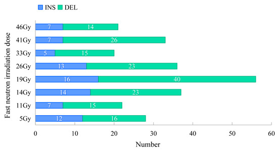 The radiation dose is an important factor affecting the mutagenic efficiency [,]. By analyzing the biological effect induced by different neutron dosages, Xu et al. [] observed that a low dosage of FN irradiation (0.38 Gy) significantly promoted the germination and radicle growth of the M1 generation of peas, and higher dosages (1.66, 4.33 Gy) reduced the plant height. Based on the germination rates and the relative variation frequencies, Zhang et al. [] showed 40~45 Gy is the appropriate dose for the FN mutagenesis of the azuki bean. Normally, a dose resulting in 50% survival of the M1 plants (lethal dose 50 or LD50) is expected to have the highest mutation frequency and is considered an appropriate dose []. In the last decade, with the rapid development of next-generation sequencing technologies, the genome mutation profile has become another important index for evaluating the mutagenic effects of FN irradiation. For example, a genome-wide analysis of mutations induced by FN irradiation in A. thaliana found that the frequency of FN-induced single-base substitution mutations was higher than that of deletion mutations and that there were more single-base deletions than large base deletions []. Similar to A. thaliana, SBSs constituted the most abundant mutation type in an FN-mutagenized population of rice []. Researchers also found that FN-induced deletions mutate the largest number of genes. However, these studies were usually carried out in the M3 and subsequent generations; so, less is known about the original number and distribution of genomic mutations in the M1 plants induced by different FN doses.