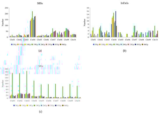 The number of SBSs, InDels and SVs in each chromosome induced by FN irradiation in the eight treatment groups. (a) FN irradiation-induced SBS mutations in each chromosome in the eight treatment groups. (b) FN irradiation-induced InDel mutations in each chromosome in the eight treatment groups. (c) FN irradiation-induced SV mutations in each chromosome in the eight treatment groups. SBSs, single-base substitutions; InDels, insertions and deletions; SVs, structural variations.